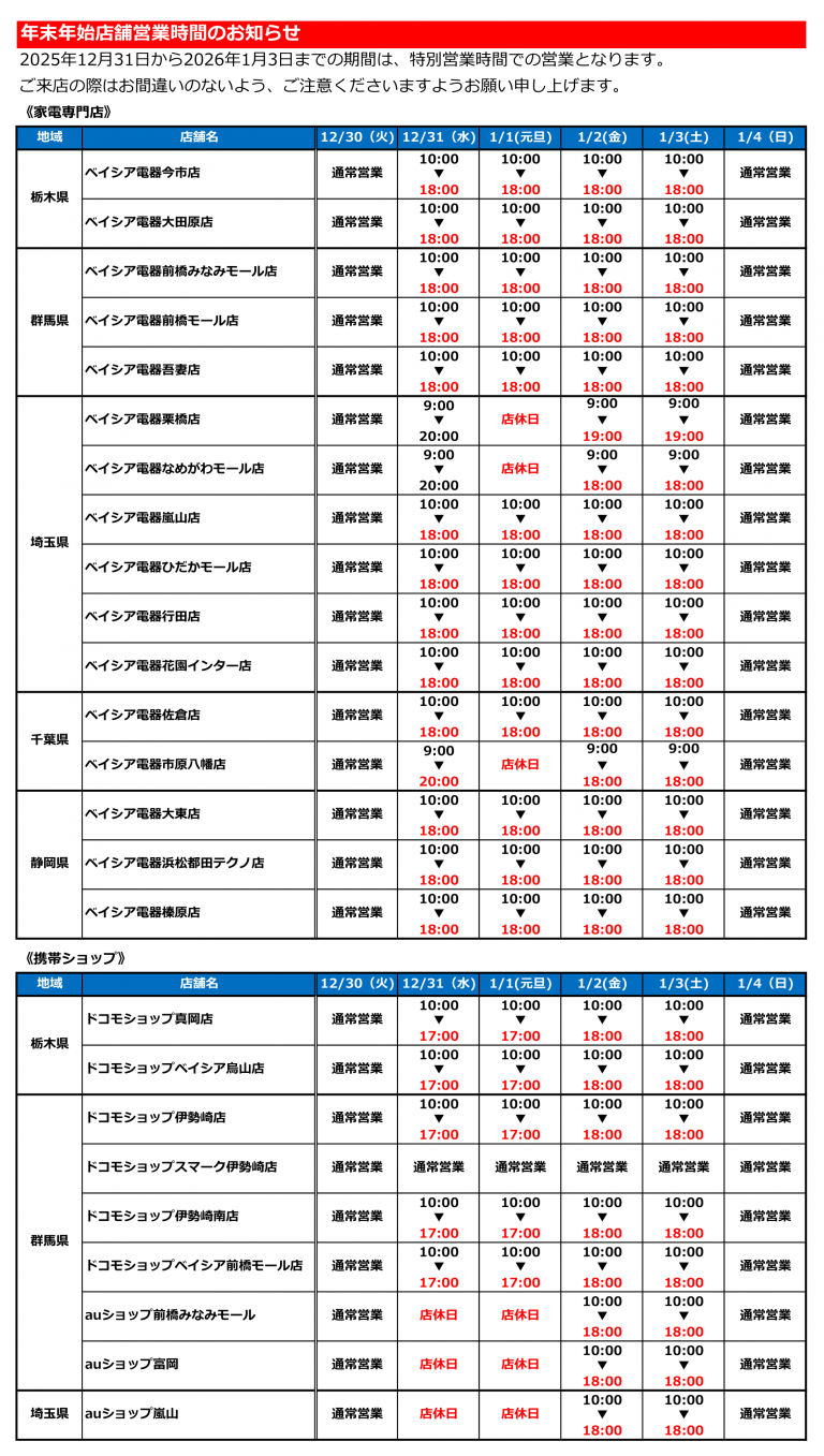 平素は格別のご高配を賜り、厚く御礼申し上げます。2026年2月1日(日)より下記の通り一部の店舗につきまして、営業時間を変更いたしますのでお知らせ申し上げます。 ベイシア電器栗橋店ベイシア電器なめがわ店ベイシア電器市原八 […] -