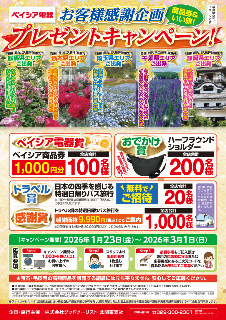 日頃のご愛顧に感謝を込めて、「商品券&いい旅!プレゼントキャンペーン」 を開催いたします。 キャンペーン期間中、税込1,000円以上お買い上げのお客様 を対象に、抽選で以下の豪華賞品をプレゼントいたします。 ■ ベイシア […] -