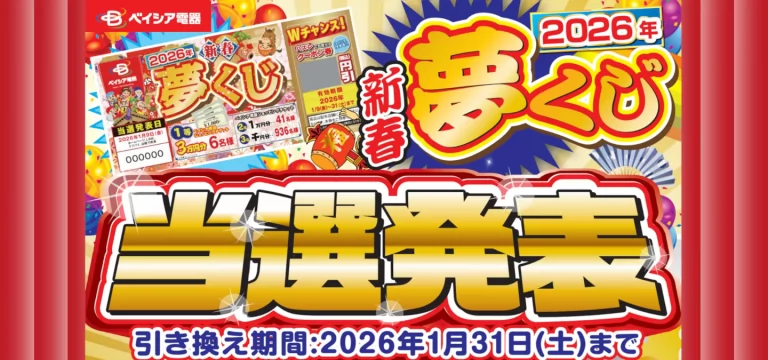 ベイシア電器全店で、商品ご購入者様を対象にお配り致しました「 新春夢くじ」の当選番号は下図の通りになります。 ご当選された方におかれましては、引き換え期間終了までに配布いたしました店舗のスタッフまでお申し出頂けますよう、 […] -