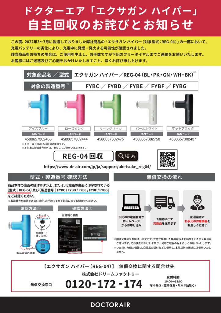 ドクターエア「エクサガン ハイパー」自主回収のお詫びとお知らせ