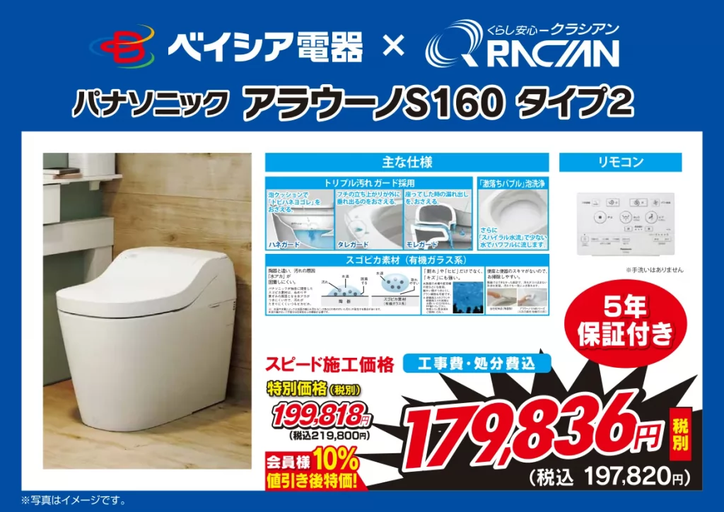 突然水が流れなくなった・・・突然便座が温まらなくなった・・・水が止まらない!なんて経験をしたことありませんか?ベイシア電器なら何と最短翌日に古い既存のトイレと新しいトイレに交換出来るんです!しかも、工事代・処分費もすべてコミコミ価格だから安心です。詳しくは、店舗スタッフまでお気軽にお問い合わせください。